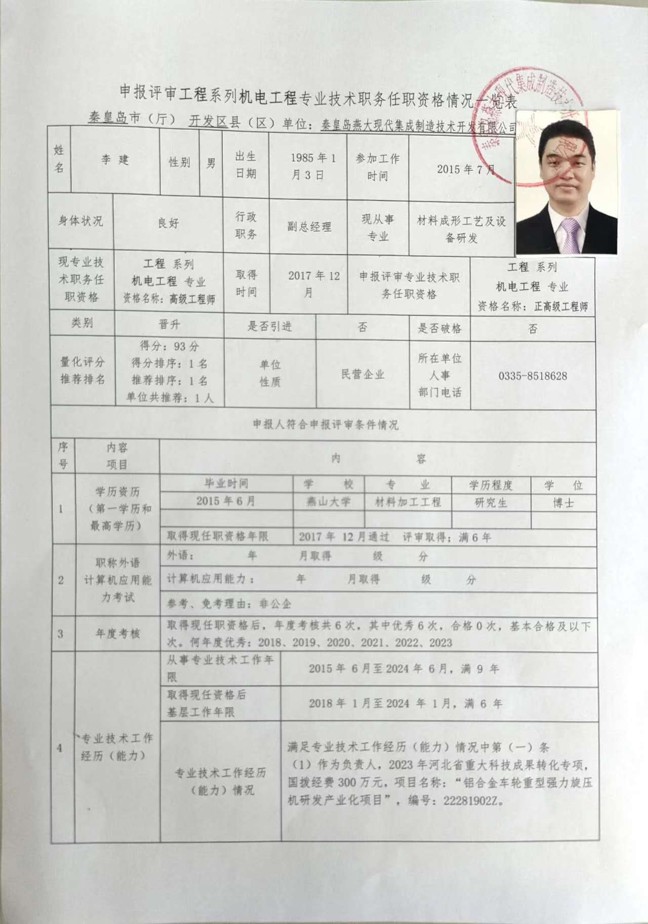 關(guān)于李建同志申報工程系列機(jī)電工程專業(yè)正高級工程師職務(wù)